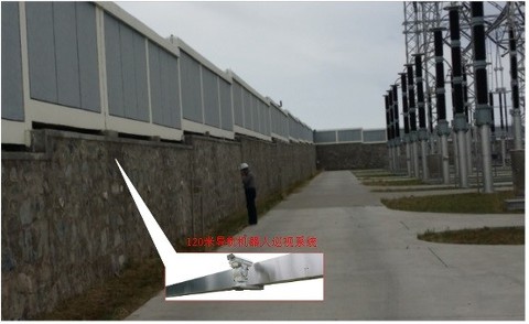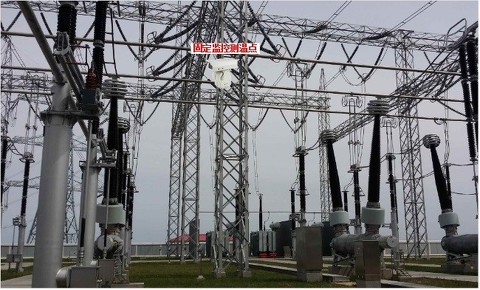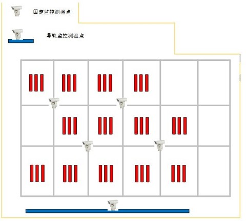 由于设备区中北部架构较多,且地面遍布检修通道,无法架设长距离导轨,为监控设备区中北部的开关盒刀闸状态,方案设计在设备区中北部的架构上分布安装4台固定监控测温点 ,可将设备区中北区域的全部刀闸开关设备100%覆盖监测。